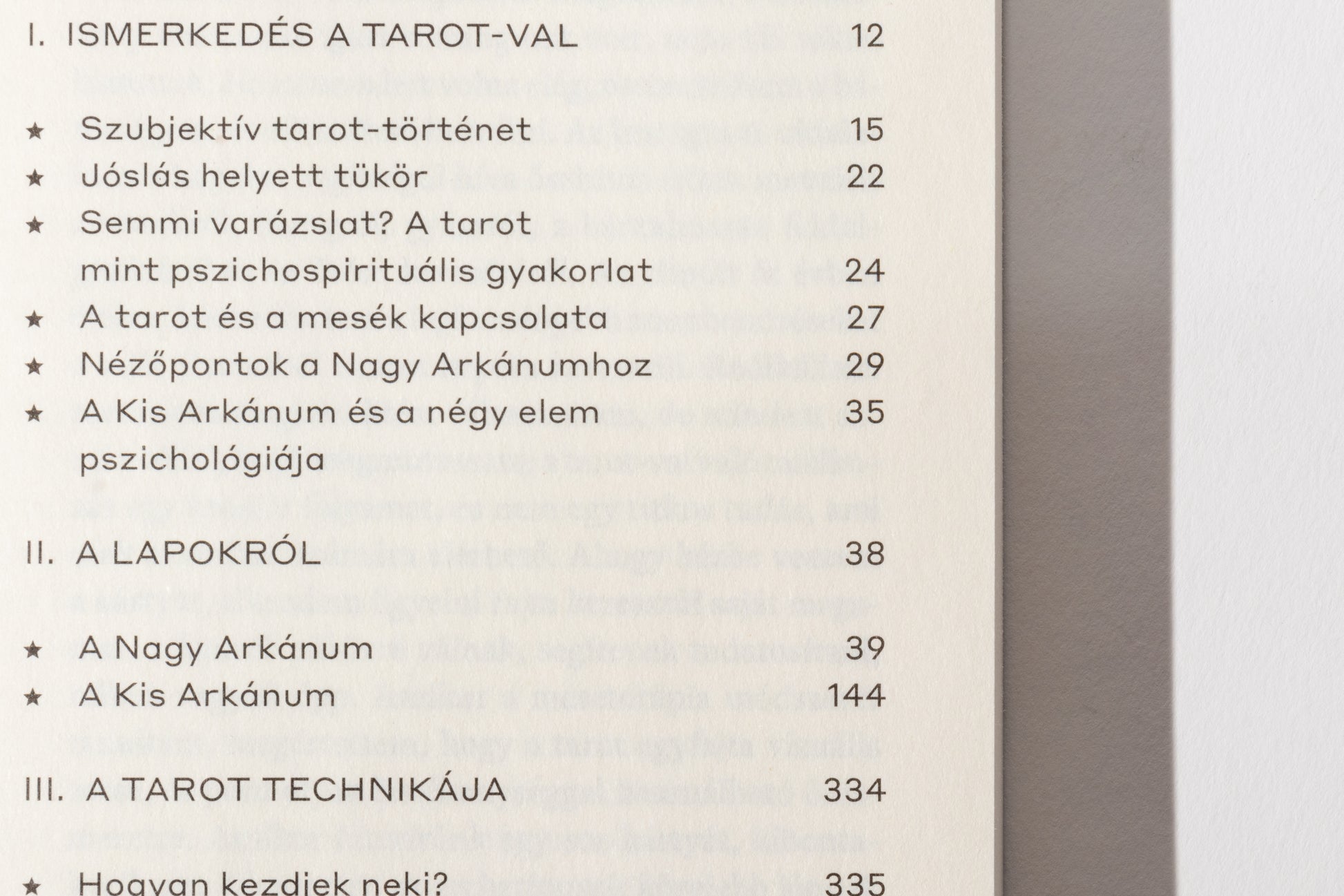Mindennapi használatra szánt könyv, amit bármikor felcsaphatunk egyedül és társaságban egyaránt, ha szeretnénk elmélyíteni a figyelmünket, vagy ha éppen inspirációt keresünk egy nehézség feltáráshoz. A tarot nem helyettesíti a terápiát, de nagyon sokat adhat hozzá. Képei csodálatos útitársaink lehetnek belső világunk ismeretlen tájainak felfedezésében.